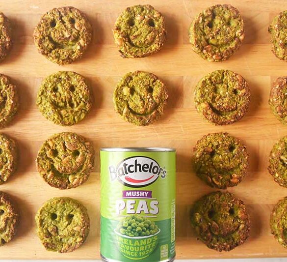 1. Place the potatoes in a pot, add water and salt and bring to a boil. After about 10mins the potatoes should be almost cooked through - at this point add in the broccoli florets, just to blanche them. Once potatoes are done, drain all ingredients in a colander and place under cold water to stop the broccoli from cooking further and to retain their green colour. 2. Transfer the ingredients into a large bowl, mashing them with a fork. If you prefer avoiding chunky pieces for your kids, use a blender to smoothen the broccoli, then add them to the smashed potatoes in a bowl. The potatoes should be mashed with a fork, otherwise they will become too creamy. 3. Add 1 whole can of Batchelor's Mushy Peas, nutritional yeast and mint leaves, mixing them in with the other ingredients. 4. Add the seasonings of your choice and blend well until you like the taste. 5. Cover the bowl and place in the fridge to allow the mixture to rest for 30mins. 6. Using an ice-cream scoop, take a portion from the cold mixture and form it into a patty with your hands. Place the patty on a baking tray lined with oven paper and pressed into a round cutter or disc for a more uniform shape. I also created "eyes" with the help of a chopstick, and the edge of a spoon to form the "smile". 7. Bake in a 180 degrees oven until both sides are golden. Alternatively you can shallow fry them in a frying pan, or bake them in an air fryer. 8. serve with lemon wedges and let the kids enjoy them, grown ups too!