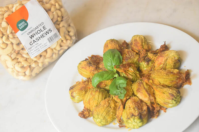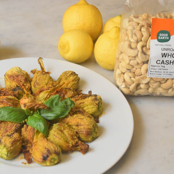20-24 zucchini flowers (cleaned and central pistil removed) 250g Good Earth raw cashews, either soaked in cold water overnight, or for a few minutes in hot water 2 tbsp apple cider vinegar juice of 1/2 lemon (or more depending on your taste) 4 tbsp nutritional yeast (you can skip this ingredient, but adds a 'cheesy' taste) salt and pepper chopped sun-dried tomatoes fresh mint or basil leaves Good Earth Extra virgin olive oil breadcrumbs 1. Soak 250g raw cashews in hot water for a few minutes 2. Drain and place in a food chopper/blender 3. Add 2 tbsp apple cider vinegar, juice of 1/2 lemon (or more depending on your taste), 4 tbsp nutritional yeast (you can skip this ingredient, but adds a 'cheesy' taste), and add seasoning (salt and pepper). 4. Blend well until all the ingredients turn into a thick paste, and add a few tbsps of water to regulate consistency, it needs to remain thick, similar to ricotta. 5. Transfer to a bowl and fold in finely chopped sun-dried tomatoes and fresh mint or basil leaves. 6. Mixture is now ready to be piped into cleaned zucchini flowers (by removing the central pistil). I used a piping bag to make a cleaner and neater job. With 250g of cashews I stuffed around 20/24 flowers. 7. Place the stuffed zucchini flowers in a round baking tray, drizzle with extra virgin olive oil, top with breadcrumbs and into the oven for just 15 minutes until golden brown. 8. Serve as a starter alongside a zucchini soup (perfect pairing), or as a side to a main course.