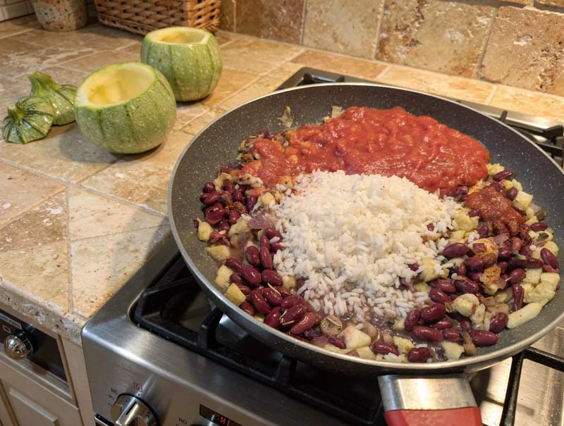 Prepare the marrows Start the filling Build the flavour Add the body Cook the rice Finish the filling Stuff & bake Bake Serve with: